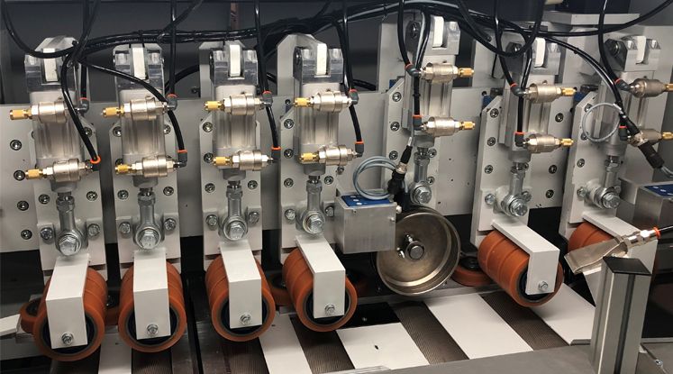 PUSH 1200 – Linea di troncatura completa di automazioni con 3 stazioni di carico, 3 spazzole per rimozione listelli, 5 postazioni di scarico e 1 carico pallet automatico.