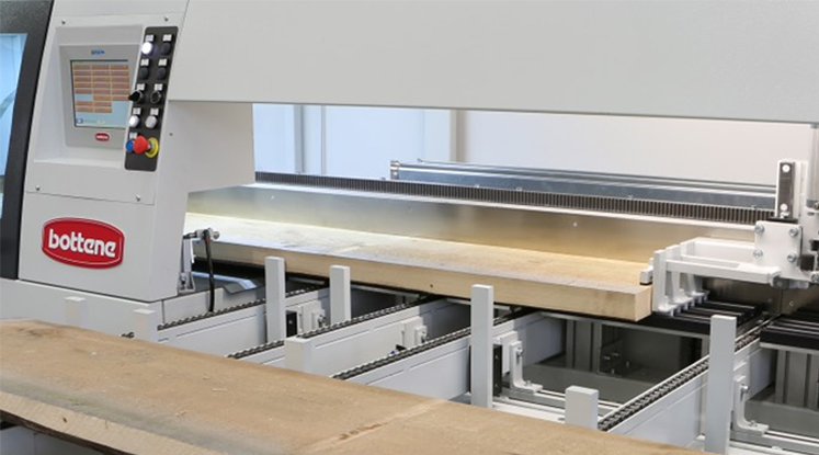 The optimizing crosscut saw PUSH 180 becomes PUSH 250 where the number 250 indicates precisely the working speed of 250 mt/1’ that all models of crosscut saw with pushing system will have. This is possible thanks to the new positioning system of the pusher with the introduction of a high-speed rack and a Brushless motor with an increased power of 50% coupled to the rack by means of an epicyclic reduction gear. The positioning system with boards clamping by means of up&down pliers ensures maximum positioning precision and the exploitation of the maximum speed both during the backward and reading of boards and when moving forward.