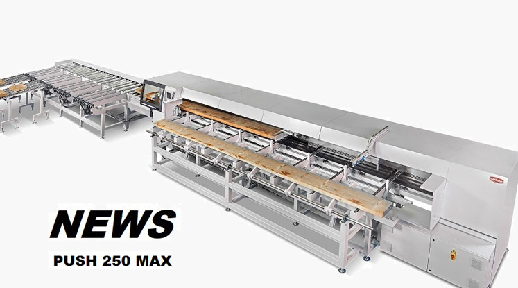 Мощная, быстрая, точная новая торцовочная пила с оптимизацией модели PUSH 250 MAX предназначена для обработки досок с большим сечением. Станок оснащается пилой Ø 800 мм и обрабатывает заготовки сечением 100×600 мм. Скорость позиционирования 250 м/мин с точностью позиционирования толкателя 1 мм. Толкатель, оснащенный пневматическими захватами с плавающей системой и захватом «снизу-сверху», обеспечивает высокую скорость позиционирования без скольжения, а во время обратного хода датчики на нем считывает длину и толщину досок, оптимизируя длину и толщину. PUSH 250 MAX обычно используется на лесопильных предприятиях между пилами первого ряда и многопильными станками, обеспечивая быстрый, точный и оптимальный раскрой древесины с минимальными отходоми. VIDEO: